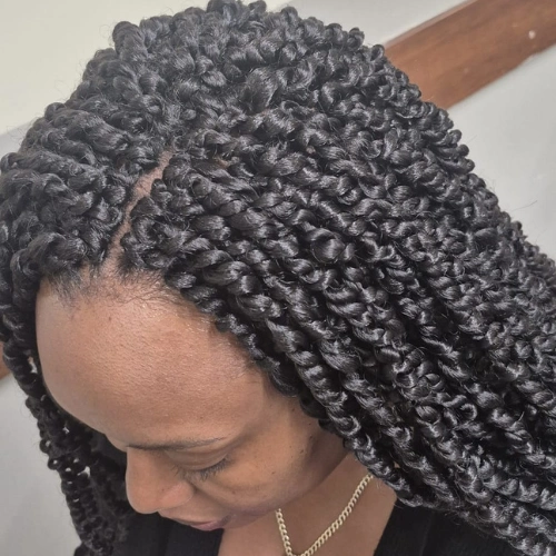 Une torsion distincte, semblable à une corde, créée en enroulant deux mèches de cheveux l’une autour de l’autre. Ce style est reconnu pour sa finition nette et sa grande durabilité, idéal pour une protection longue durée.