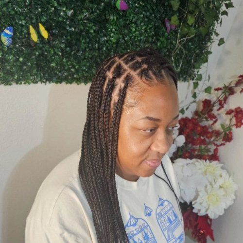 Un style magnifique combinant des tresses de taille moyenne, souvent accentuées de perles ou de manchettes, encadrant parfaitement le visage. Une beauté intemporelle rencontre une touche moderne.